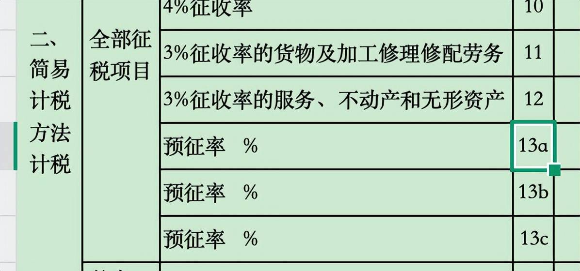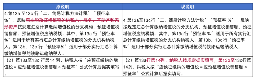 (二)附表1(本期发卖环境明细),对建建办事预收款区分“据实填写预缴税款”和“按公式计较后据实填写”两种景象:第13a行“预征率 %”合用于所有实行汇合计算缴纳的分支机构纳税人;第13b、13c行“预征率 %”合用于部门实行汇合计算缴纳的铁运输纳税人。13a第14列改为据实填写预缴税款,第13b至13c行第14列,按‘应预征缴纳的=应预征发卖额×预征率’公式计较后据实填写”。